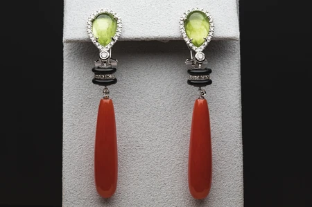A close-up view of a stylish jewelry set featuring a gold chain necklace and silver earrings with geometric designs.
