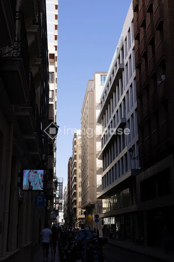 A narrow street lined with modern and classic buildings under a clear blue sky.