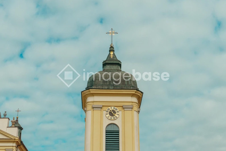 A yellow church tower with a clock and cross set against a cloudy blue sky.