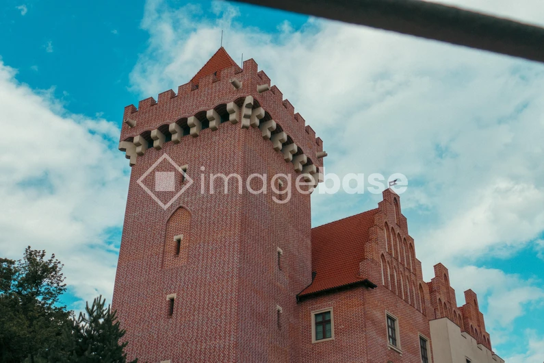 A charming brick castle against a vibrant blue sky, featuring classic architectural details.