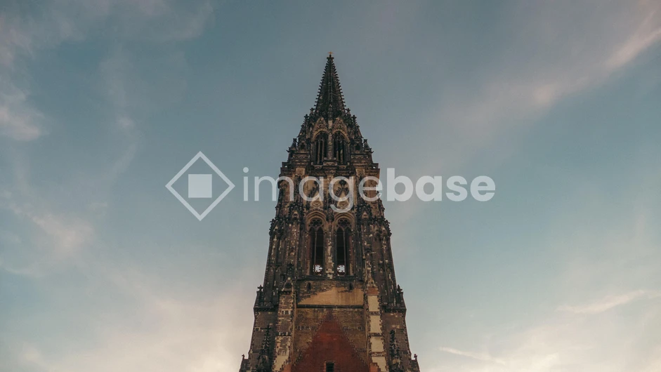 A dramatic view of a Gothic-style spire reaches into the sky, set against a backdrop of a clear blue sky.