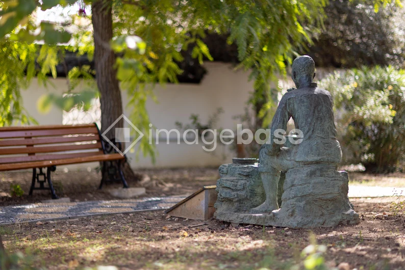 A quiet garden features a bench and a contemplative statue of a seated figure under a tree.